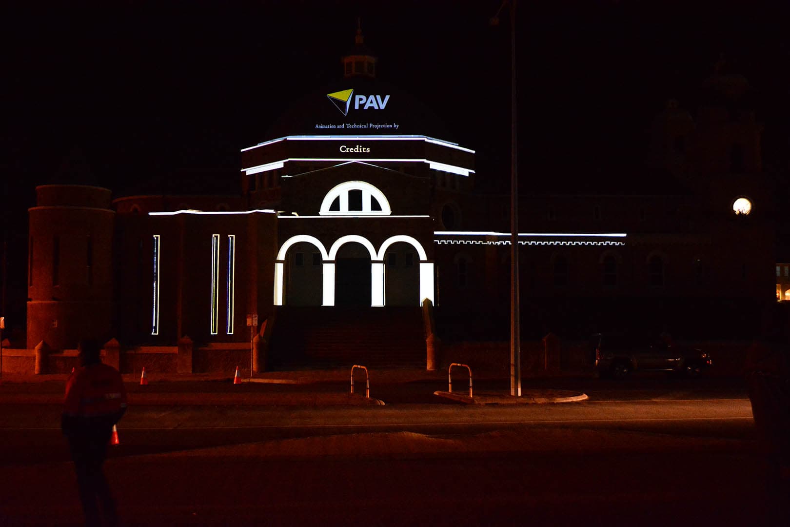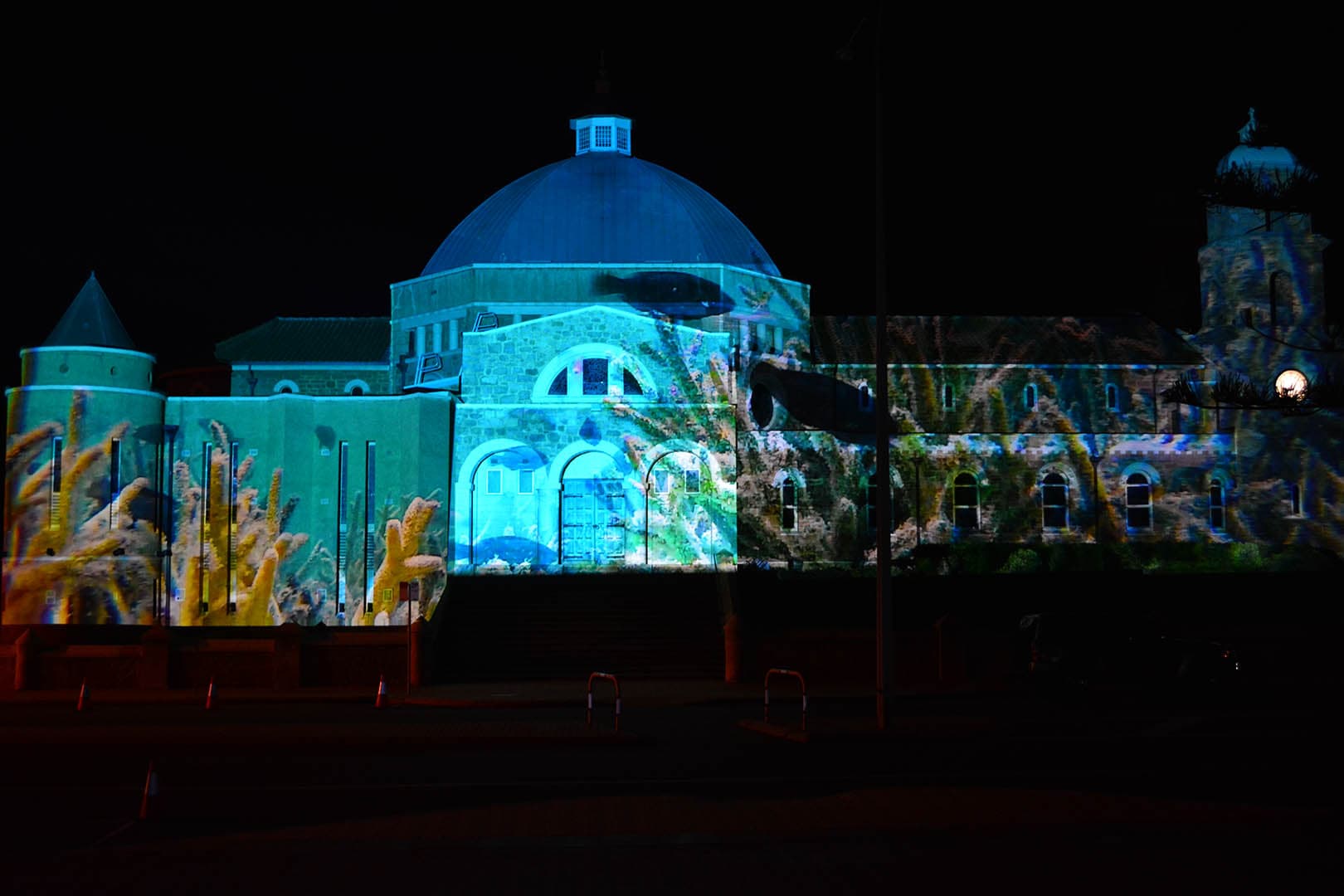 PAV projection-mapped the 100-year-old St. Francis Xavier Cathedral with custom illusion and perspective style projection mapping mixed with custom animated underwater 3D content complete with cuttlefish, dolphins, jellyfish, sharks, turtles, coral and plant life to represent the ecology of the Abrolhos islands where the Dutch Landed 400 years ago.
