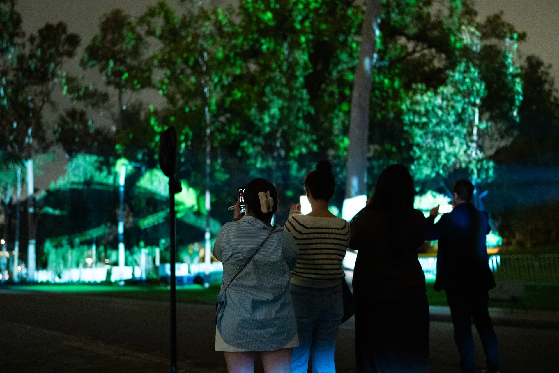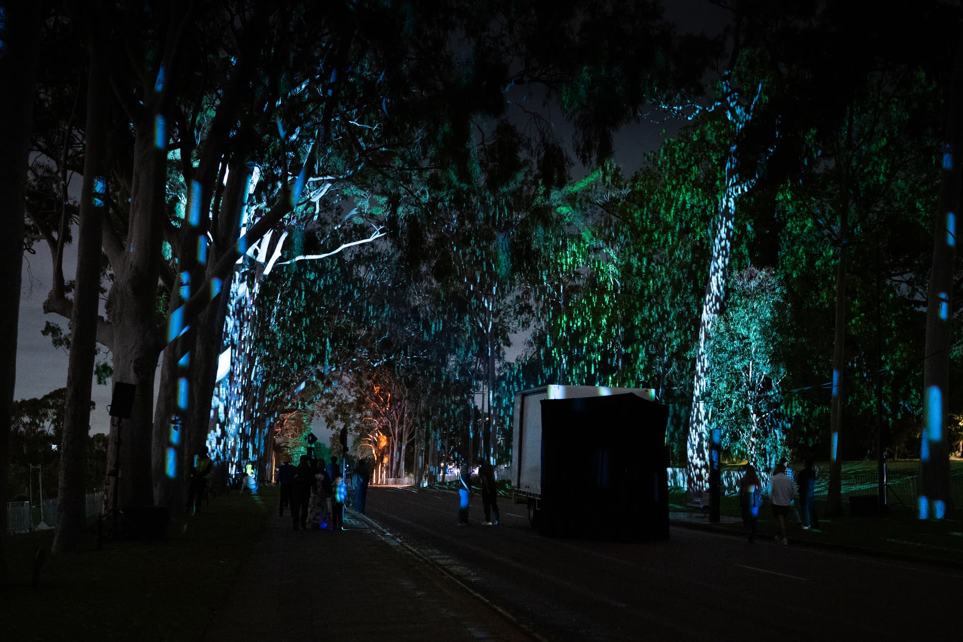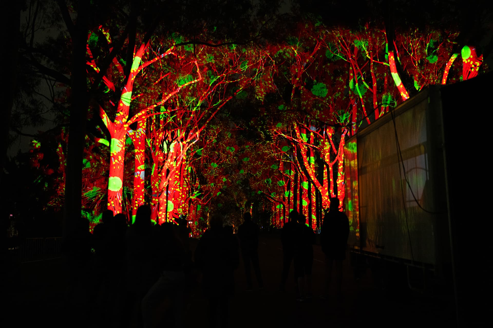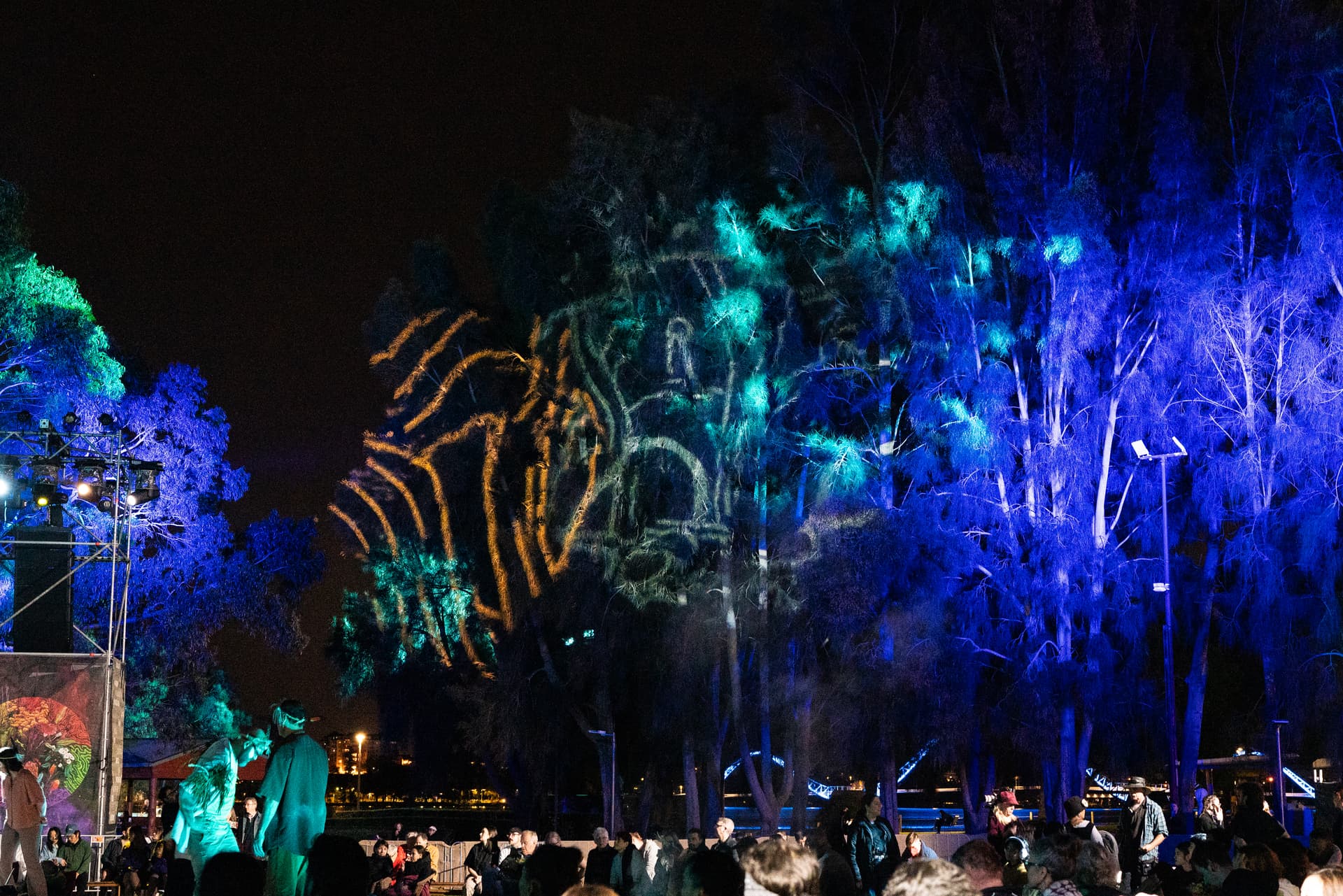 As attendees wander through the installation, they witness scenes of regrowth, fire, rain, and plant and animal life flourishing—all projected onto the treetops of Kings Park.