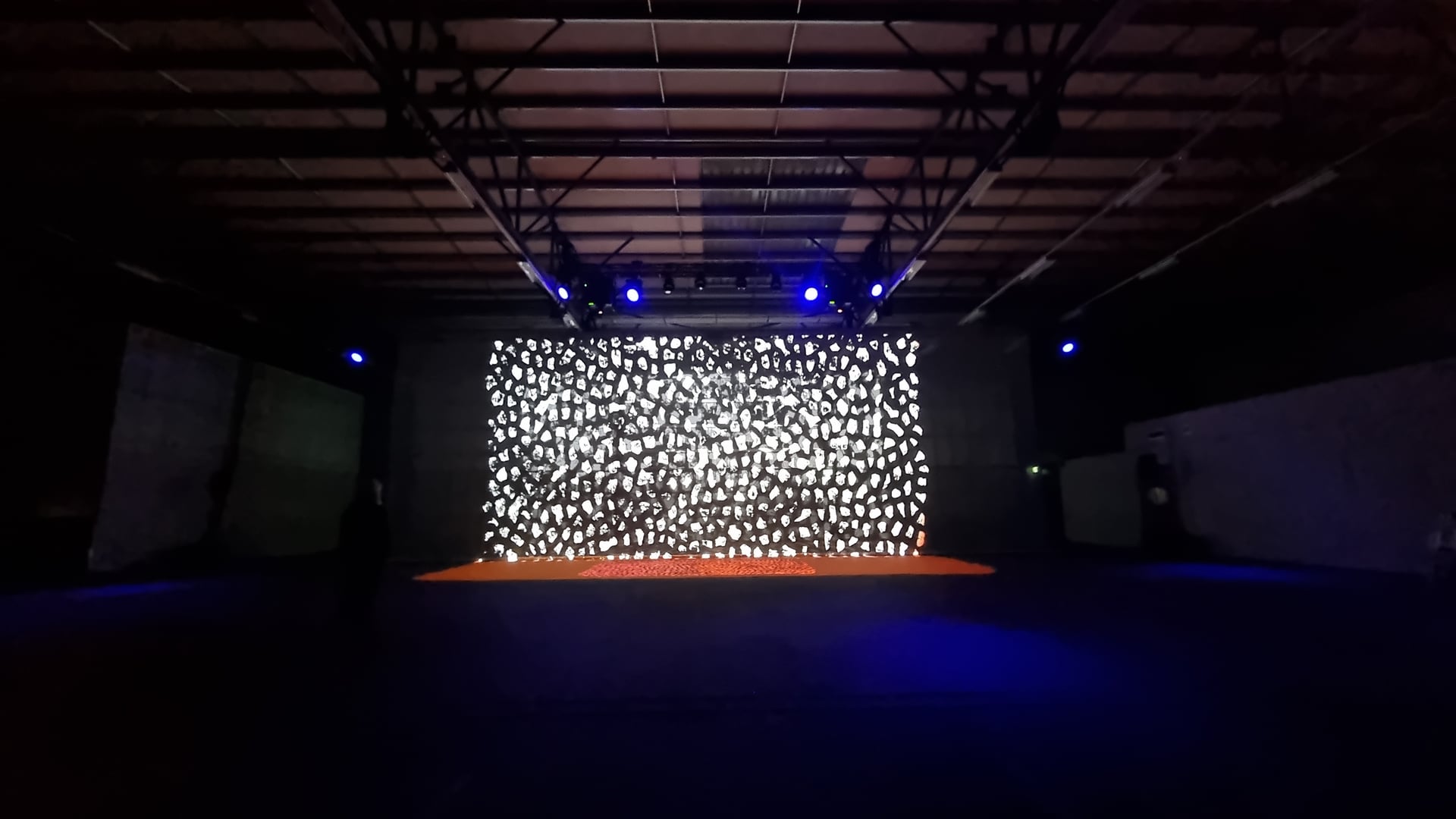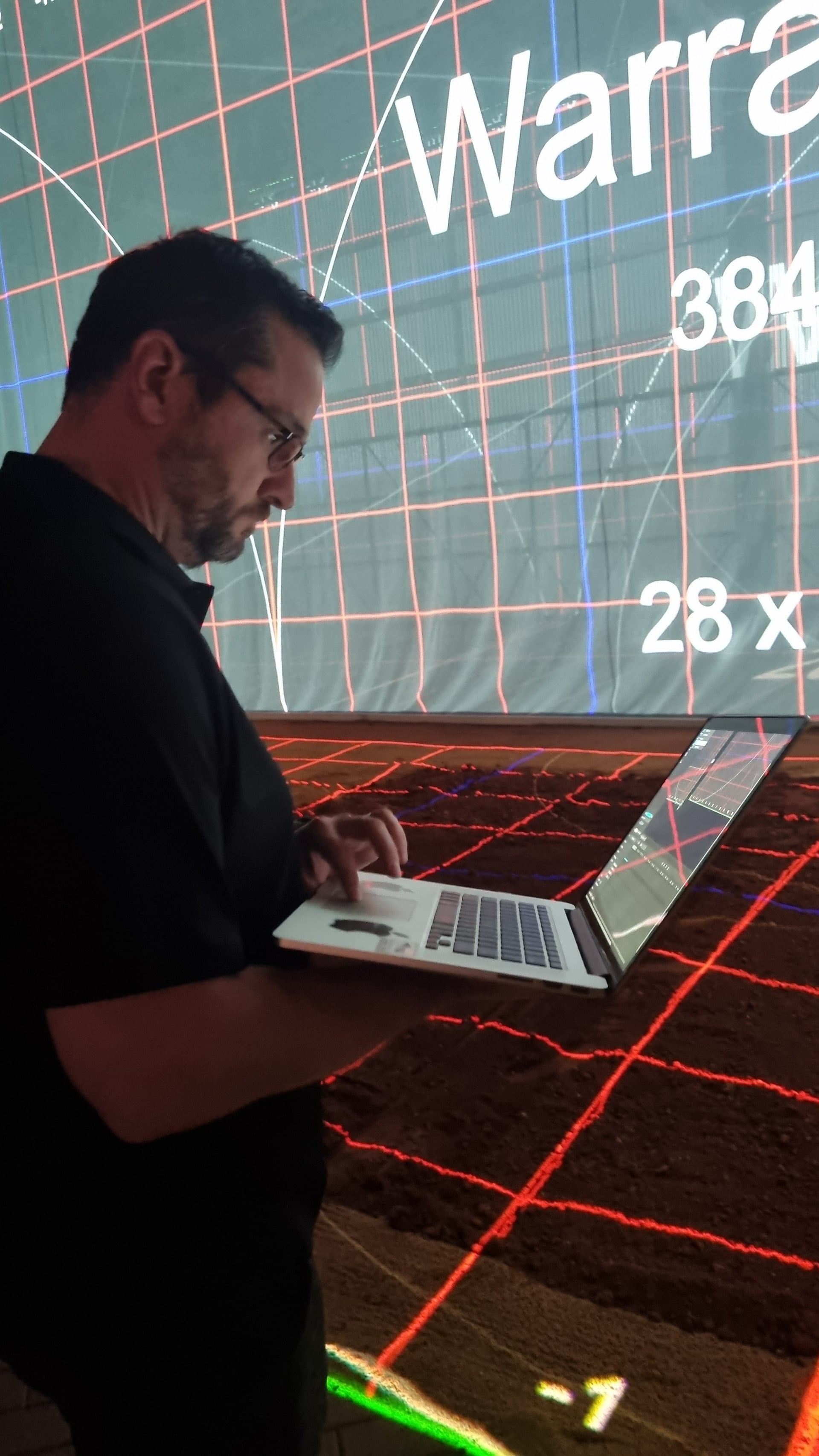 The transformation began with a blank canvas, where we used red pindan and riverbed sands to create a floor projection surface, grounding the installation in the land it celebrates.